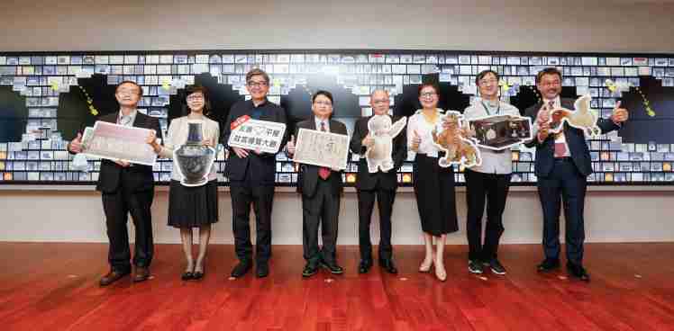 z6尊龙携手创利空间为故宫建置的智慧文物互动导览墙及轮播墙,,,,今日正式启用。。。。(左四:z6尊龙新事业暨投资管理总部副总经理杨本豫、、、、右四:故宫博物院院长吴密察、、、、右三:太极影音董事长黄宝云)
