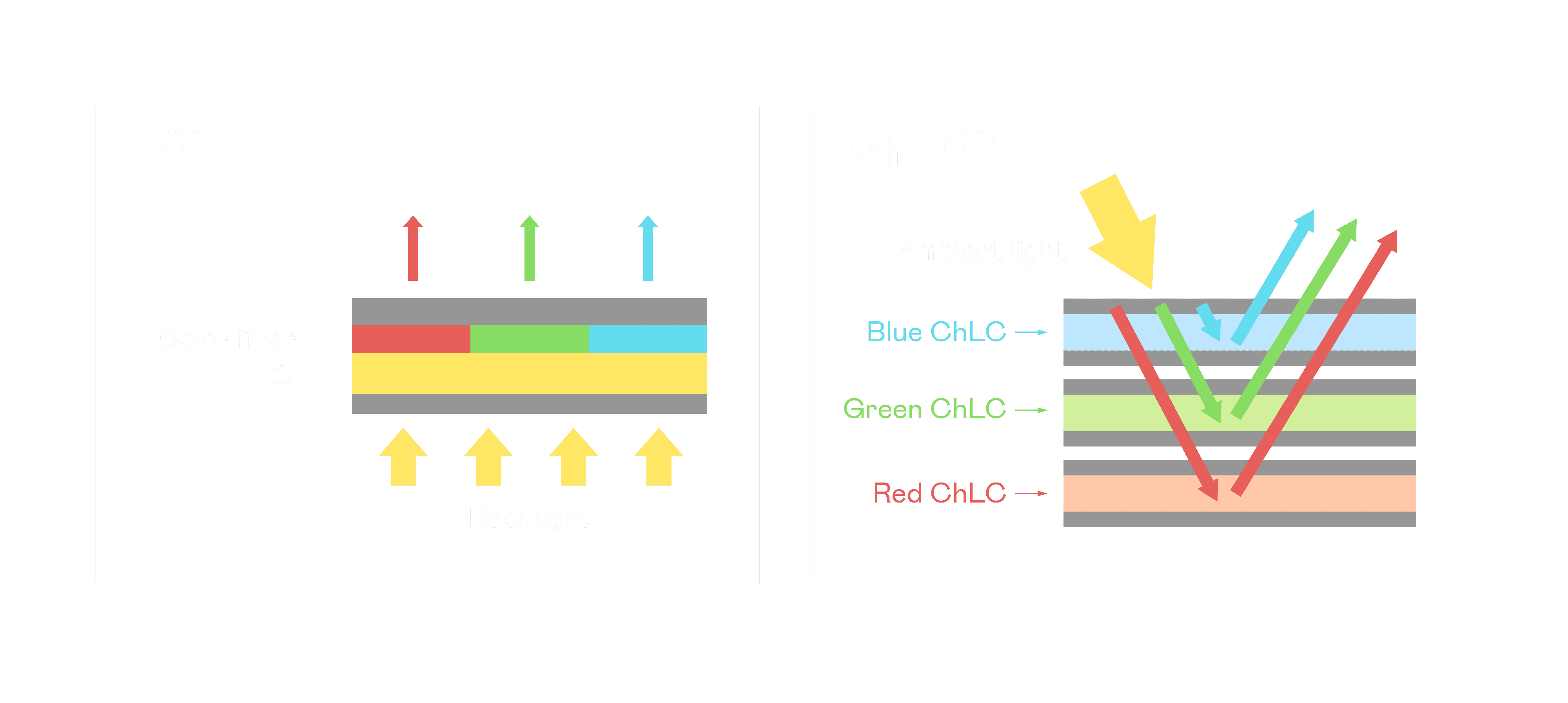 ChLCD 胆固醇液晶就如同纸张一样,,,透过反射环境光来显示影像,,,,因此长时间观看不易造成人眼视觉疲劳,,可达到护眼效果。。当处于户外阳光下使用,,LCD 影像容易失真而不易观看,,,但胆固醇液晶仍可维持较佳的影像品质。。
